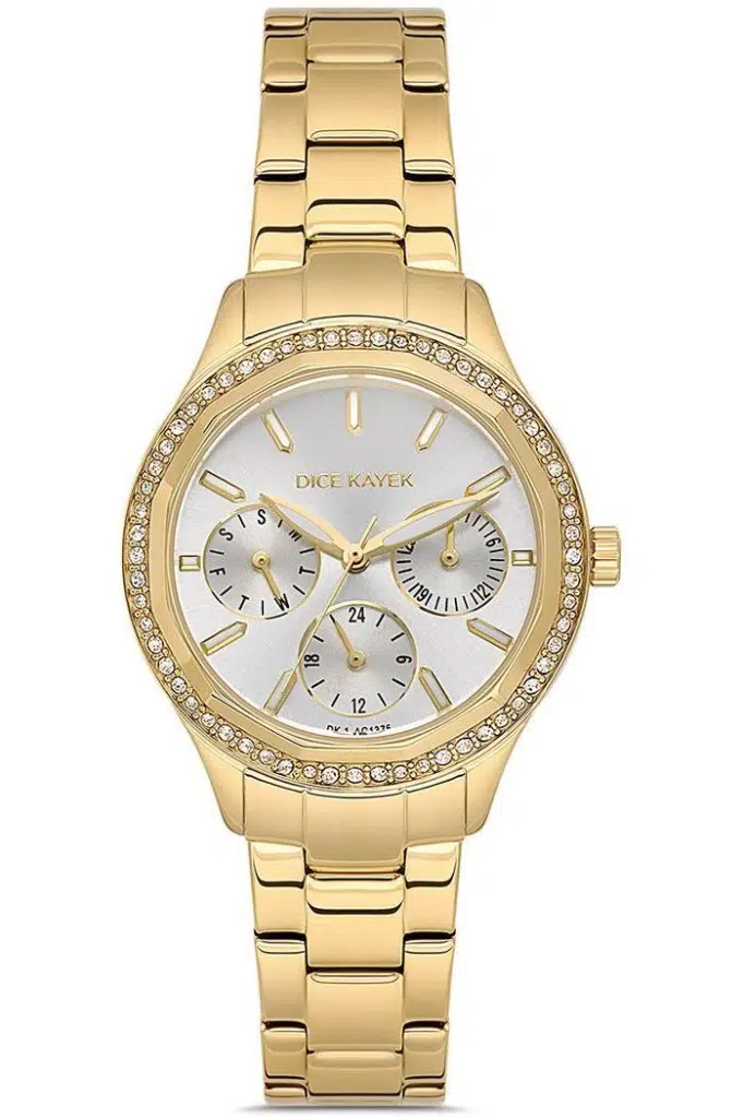 Etiketler | Dice Kayek DK.1.AG1375.03 Taşlı Tasarım Çelik Kordon Çelik Kasa 5 ATM Suya Dayanıklı Altın Renk Kadın Kol Saati |