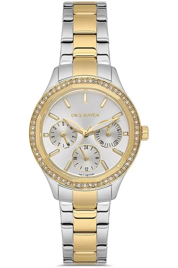 Etiketler | Dice Kayek DK.1.AG1375.04 Taşlı Tasarım Çelik Kordon Çelik Kasa 5 ATM Suya Dayanıklı Metalik-Altın Renk Kadın Kol Saati |