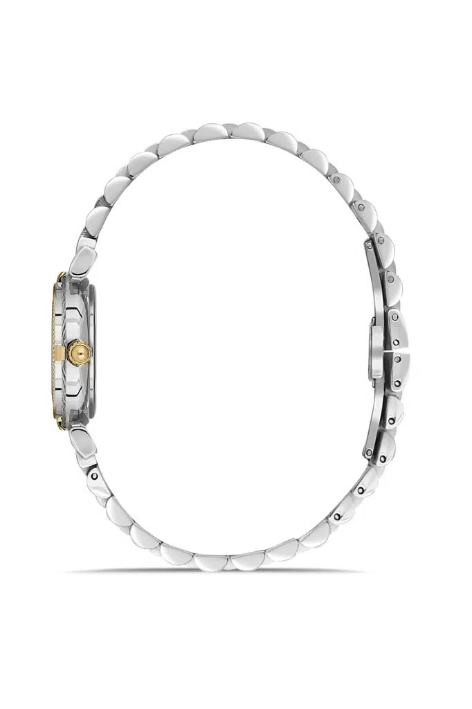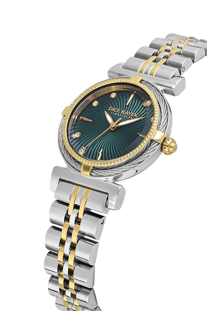 Dice Kayek DK.1.AG1401.03 Taşlı Tasarım Çelik Kordon Çelik Kasa 5 ATM Suya Dayanıklı Metalik-Altın Renk Kadın Kol Saati