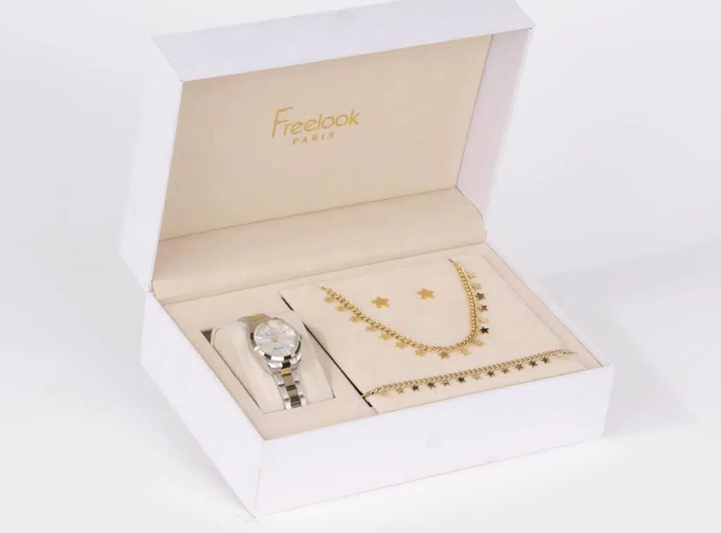 Etiketler | Freelook FL.1.10488-3 Kolye Bileklik ve Küpe Hediyeli 5 ATM Suya Dayanıklı Çelik Kordon Gümüş-Altın Kadın Kol Saati |