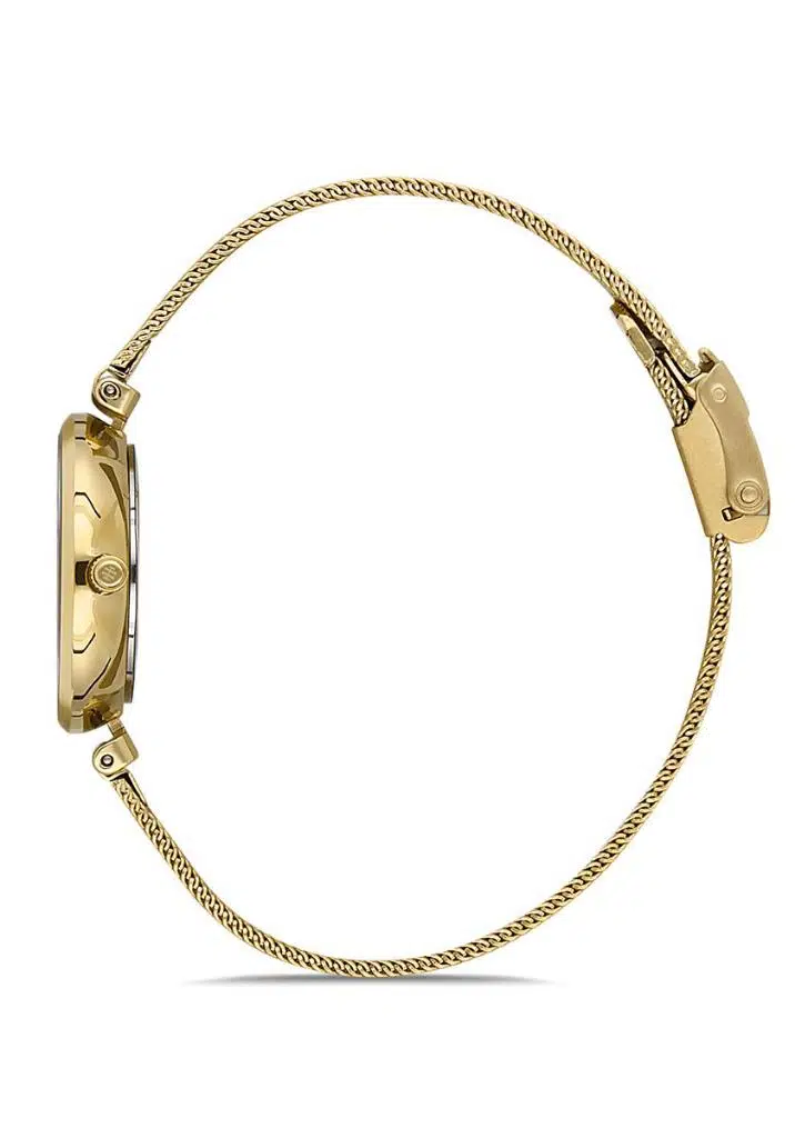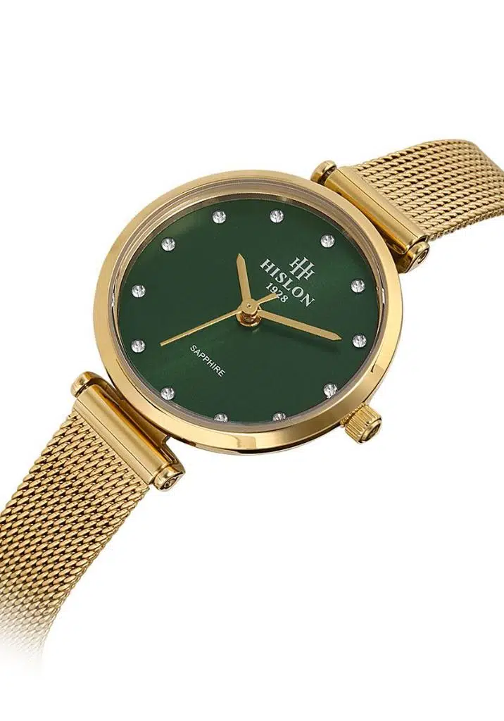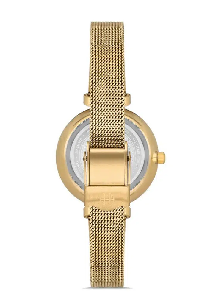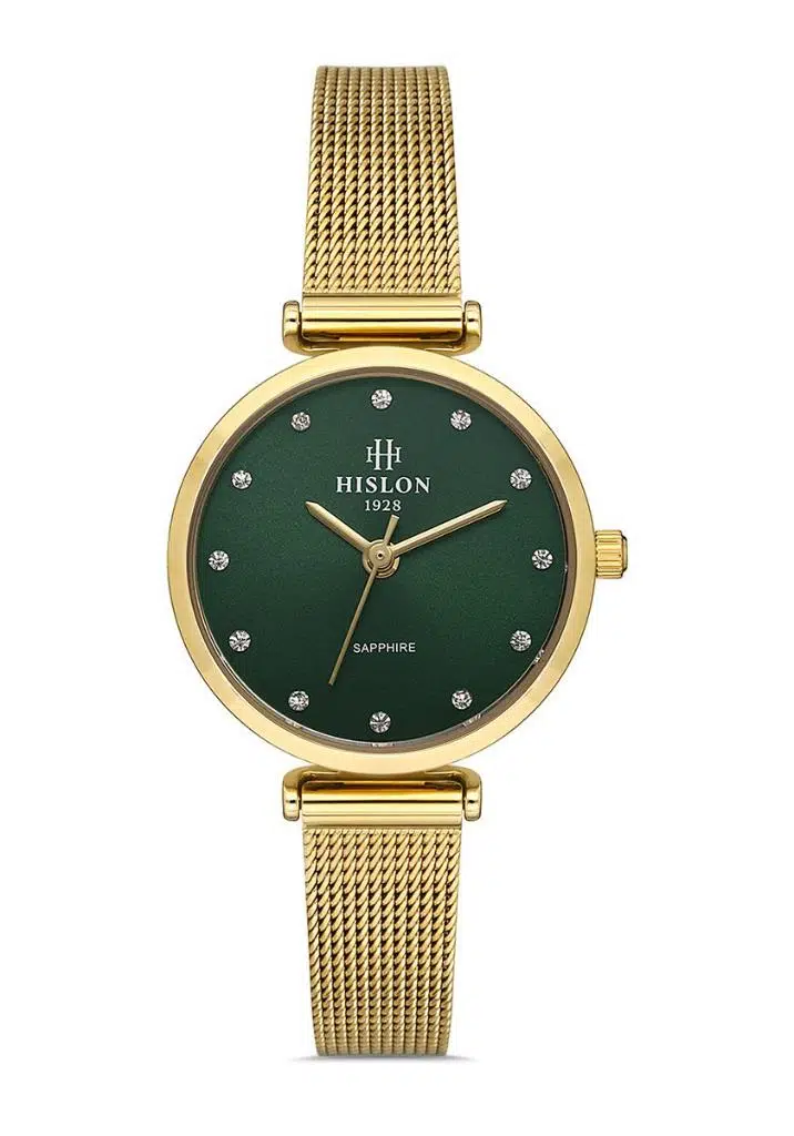 Hislon QL125G-15SG Safir Camlı Taşlı Tasarım Hasır Kordon Çelik Kasa 3 ATM Suya Dayanıklı Altın Renk Kadın Kol Saati
