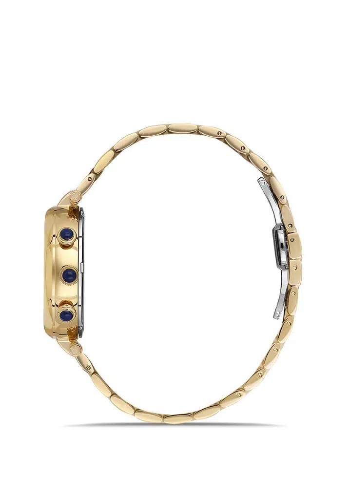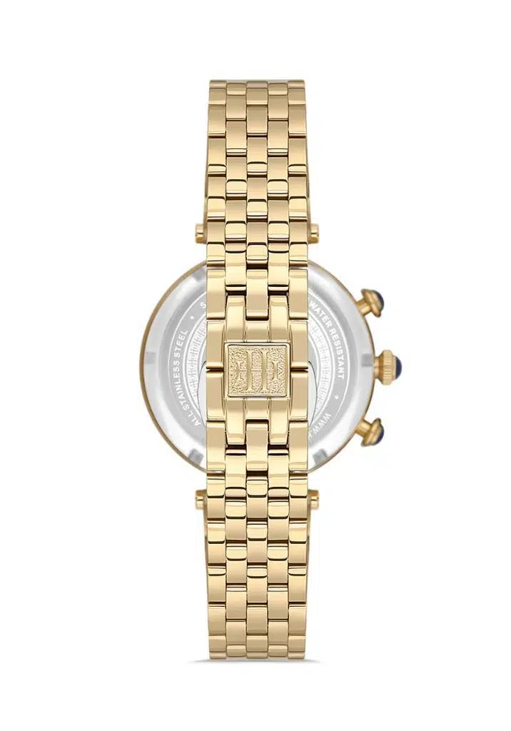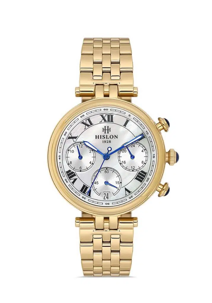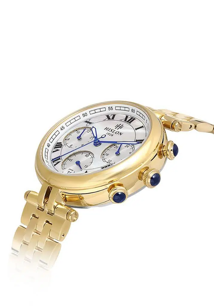 Hislon QT144G-09SG Tüm Fonksiyonları Aktif Safir Camlı Çelik Kordon Çelik Kasa 5 ATM Suya Dayanıklı Altın Renk Kadın Kol Saati