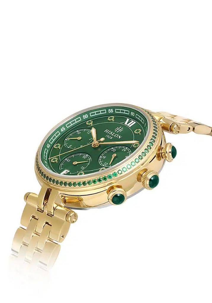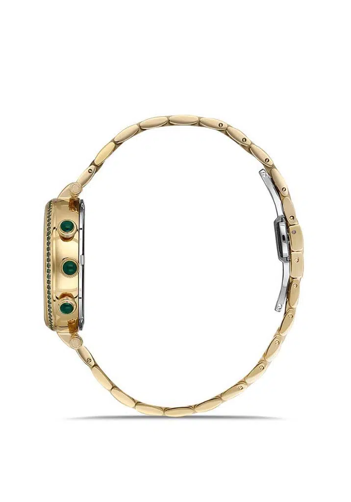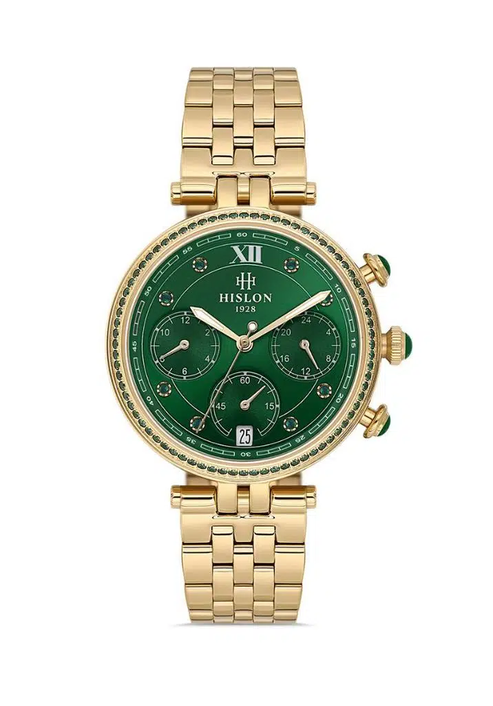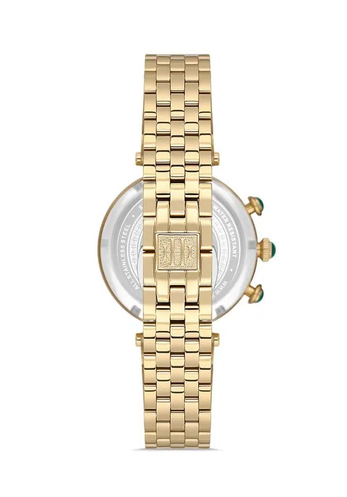 Hislon QT144G-15SG Tüm Fonksiyonları Aktif Safir Camlı Çelik Kordon Çelik Kasa 5 ATM Suya Dayanıklı Altın Renk Kadın Kol Saati