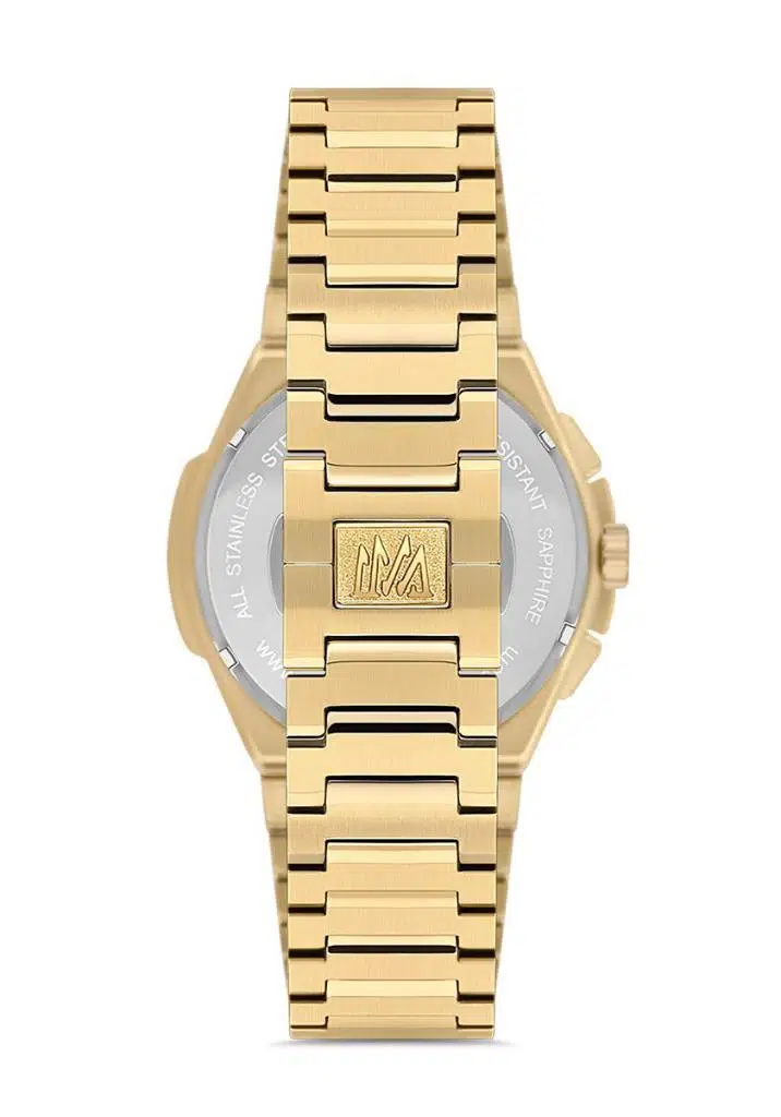 Momentus SM390G-15SG Tüm Fonksiyonları Aktif Safir Camlı Çelik Kordon Çelik Kasa 5 ATM Suya Dayanıklı Altın Renk Erkek Kol Saati