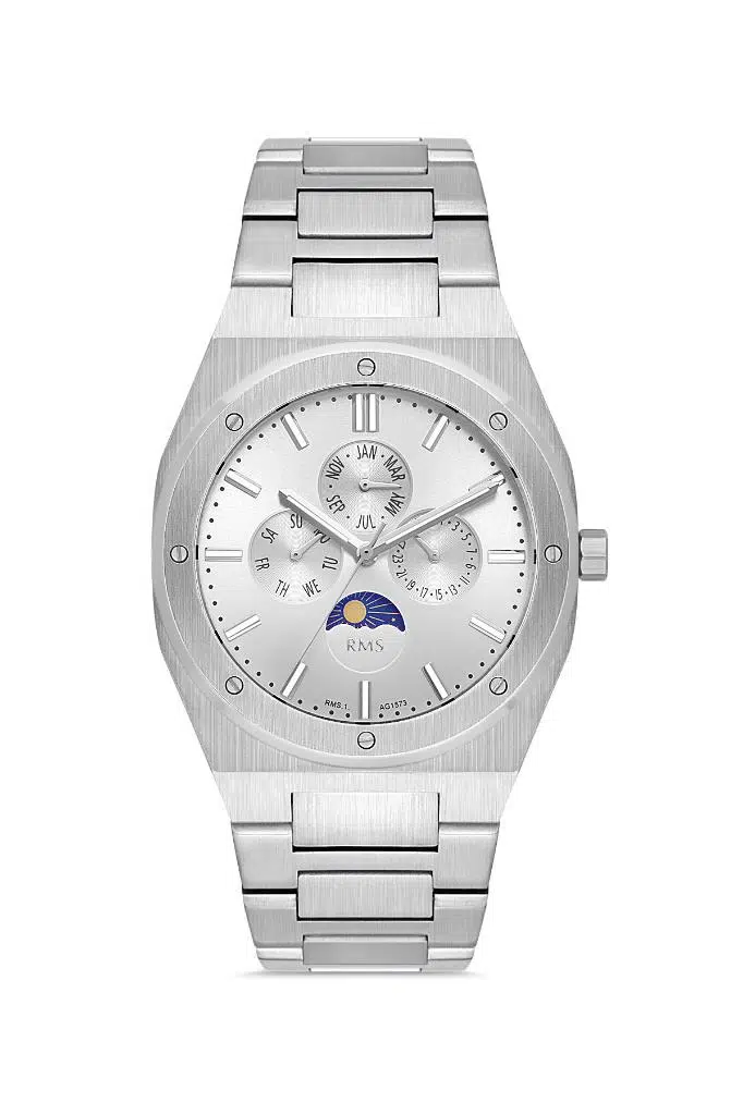 Rms Zeitmeister RMS.1.AG1573.01 Tüm Fonksiyonları Aktif Kristal Camlı Gün Ay ve Takvim Göstergeli 5 ATM Suya Dayanıklı Çelik Kordon Metalik Renk Erkek Kol Saati